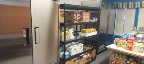I showed up, I can’t remember what for, and there was Bob, constructing some shelves. They probably won’t get everything off of the floor, (we have cases of some things), but it’ll help!